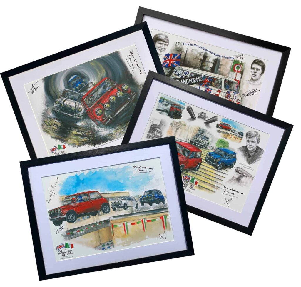 As featured on the front cover of Mini World Magazine, Bex has also created other exclusive Mini Artworks, signed by the Movie Director’s wife Hazel Collinson and John Michael Cooper– as without the Mini Cooper- it wouldn’t be The Italian Job we all know and love today!